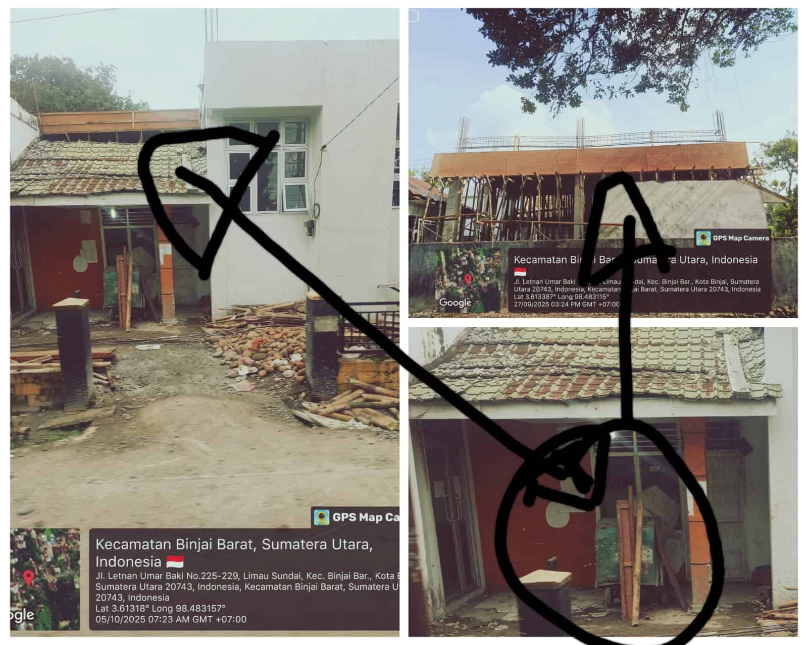 Selain tidak ada Plank Proyek, tahapan pengecoran beton pada sambungan lantai atas terlihat menggunakan manual pengadukan bahan campuran semen dengan metode mesin mollen. Indikasi asal jadi, dugaan juga terlihat tidak menggunakan vibrator getar.