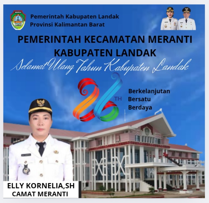 Camat Meranti, Elly Kornelia, S.H, mengucapkan selamat ulang tahun ke-26 kepada Pemerintah Kabupaten Landak dengan mengusung tema “Berkelanjutan, Bersatu, Berdaya.”