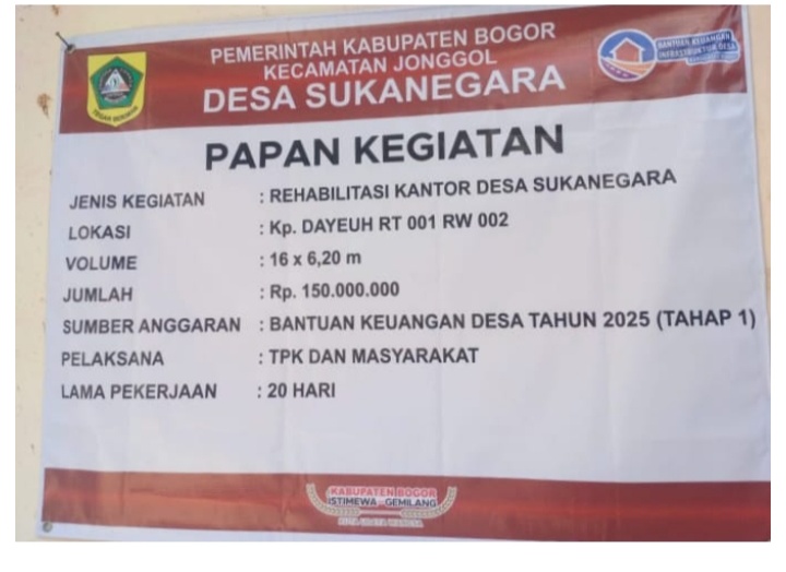 Kepala Desa Sukanegara. H. Ahmad Yani, S.Pd, mengatakan pada Awak media di ruangannya, Anggaran Dana Samisade Tahun 2025 untuk Rehabilitasi kantor desa Sukanegara yang berlokasi di Kampung Dayeuh RT 01 RW 02, dengan Volume P 16 X 6,20 M dengan menelan anggaran. Sebesar Rp.150.000.00,- ( Seratus Lima Puluh Juta Rupiah ) Demi terciptanya pelayanan terbaik buat masyarakat. Tutur Ahmad Yani, Kamis (23/10/2025)