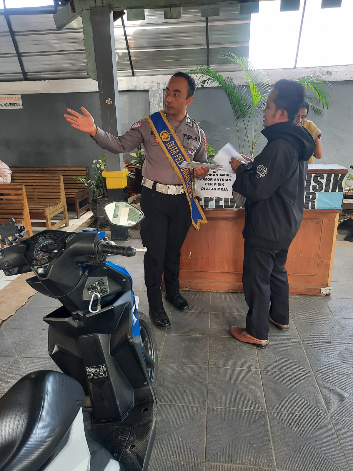 Bripka Kharir sebagai salah satu Duta Pelayanan Samsat di Unit STNK Samsat Pembantu Majenang memberikan informasi terkait PU 5 tahunan serta cek fisik kendaraan kepada wajib pajak. Di bagian cek fisik kendaraan bermotor. Jum’at, 7/11/2025.