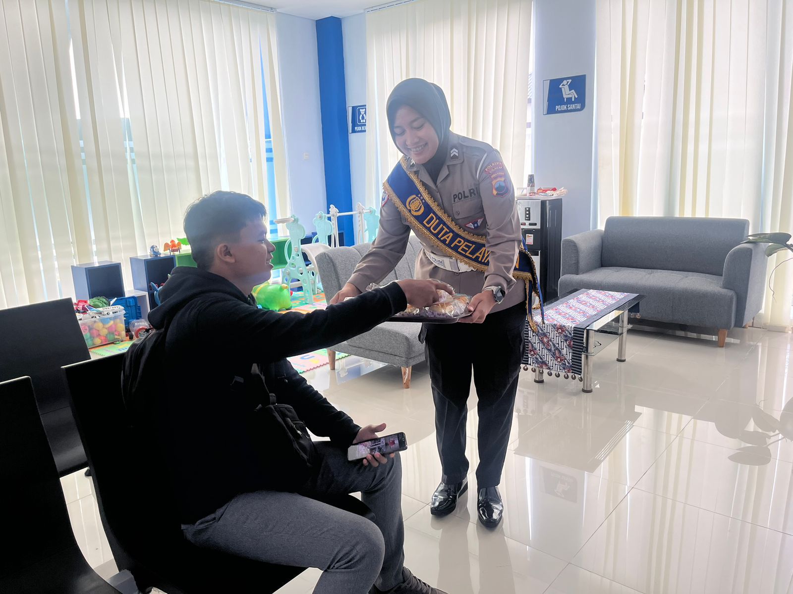 Briptu Siti, Unit BPKB Polresta Cilacap, memberikan snack kepada masyarakat yang tertib pajak dan taat administrasi kendaraan yang sedang menunggu antrian di kantor Samsat. Sabtu, 8/11/2025.