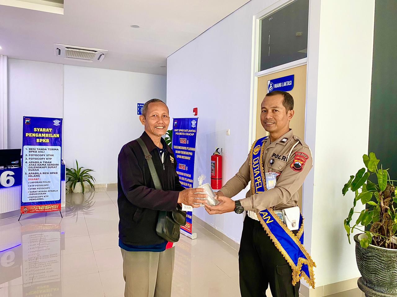 Aiptu Tri Wahyudi, Unit BPKB Satlantas Polresta Cilacap, memberikan reward kepada pemohon BPKB yang sudah tertib pajak dan administrasi kendaraan di Kantor Pelayanan Samsat, Senin (17/11/2025).