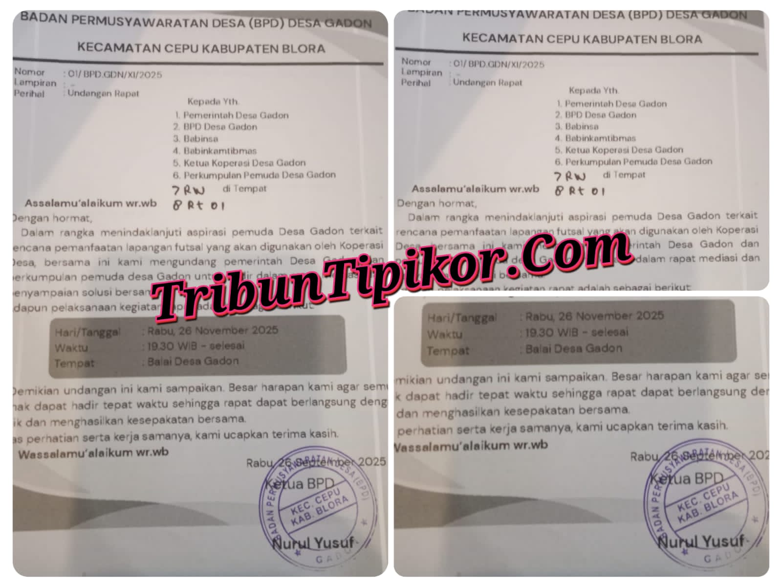 Disampaikan: rapat mediasi antara Pemdes, BPD, dan unsur pemuda dijadwalkan berlangsung pada Rabu, 26 November 2025 pukul 19.30 WIB di Balai Desa Gadon. Pertemuan ini diharapkan dapat menghasilkan keputusan yang adil dan disepakati bersama. (*Yon/G)
