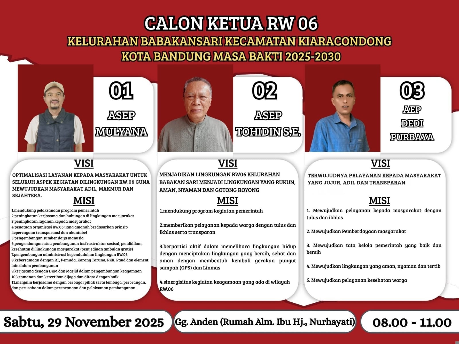 Harapan dari Panitia penyelenggaraan pemilihan Ketua RW ini,semoga Bapak Asep Tohidin SE Amanah dalam mengemban tugas karena Ketua RW adalah ujung tombak dalam pelayanan bagi warga masyarakat kelurahan Babakan Sari kecamatan Kiara condong khususnya warga RW 06.