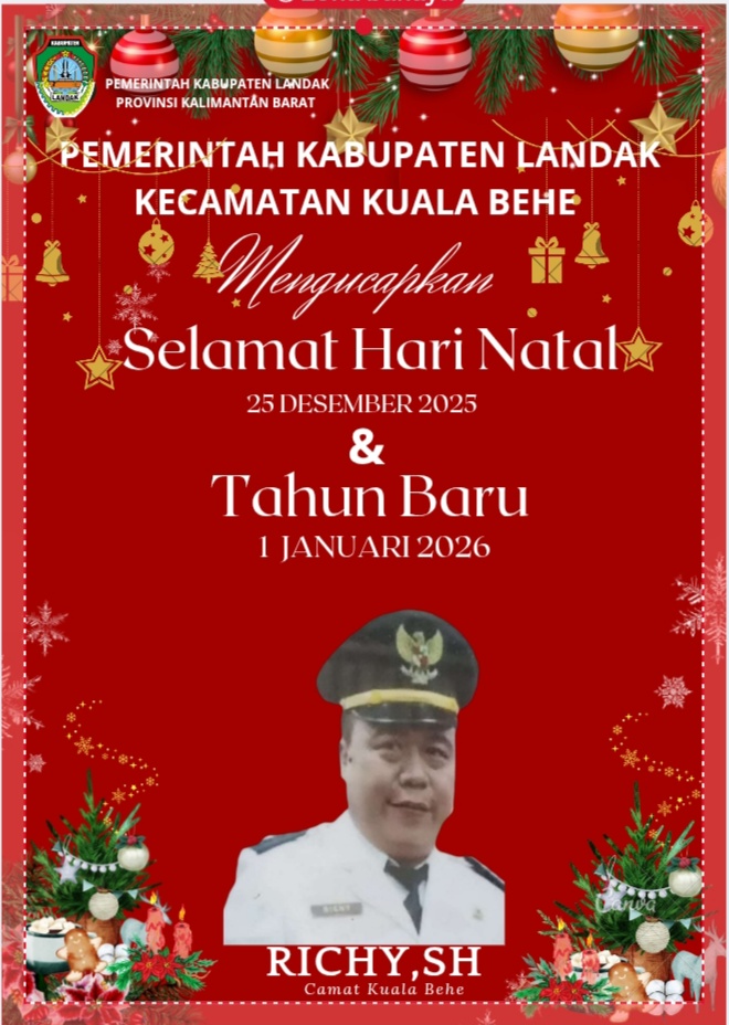 Dalam suasana penuh kedamaian dan kasih, Camat Kuala Behe, Richy, SH, menyampaikan ucapan Selamat Merayakan Hari Raya Natal 25 Desember 2025 dan Tahun Baru 1 Januari 2026 kepada seluruh masyarakat Kecamatan Kuala Behe dan sekitarnya.