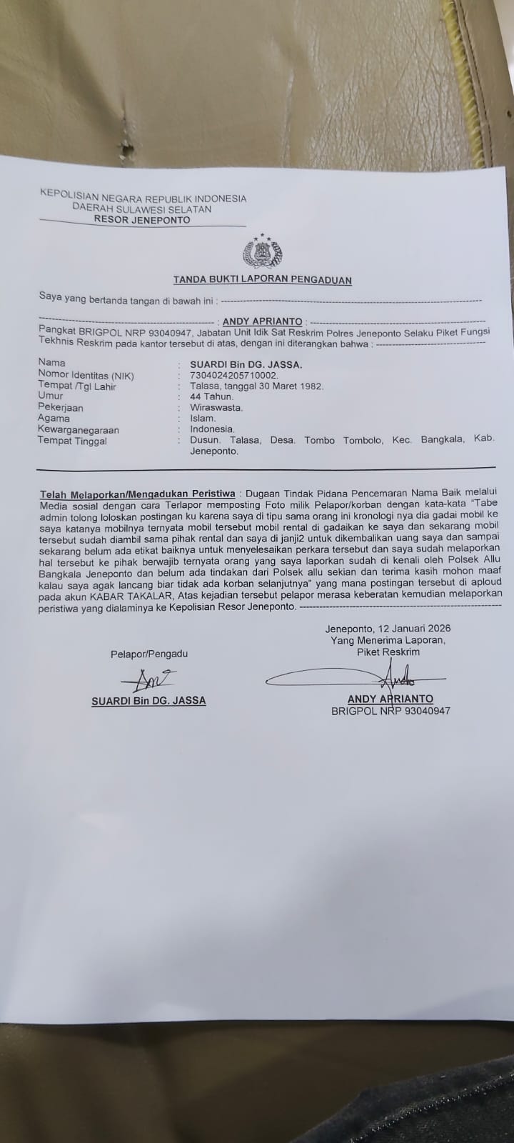 .Suardy Mile.( 44 ) Tahun , resmi melaporkan Safaruddin di Reskrim Polres Jeneponto terkait atas ada nya dugaan pencemaran nama baik yang Piral di Media Sosial (Medsos) yang sering digunakan seseorang untuk menyerang orang lain dengan tujuan mempermalukan meski narasi yang disebarkan terkadang tidak benar, tentu hal ini merupakan perbuatan pidana pencemaran nama baik dan pelanggaran Undang-Undang Informasi dan Transaksi Elektronik (ITE), Hal ini di katakan oleh Suardy Kepada wartawan media ini senin 12/1/2026.