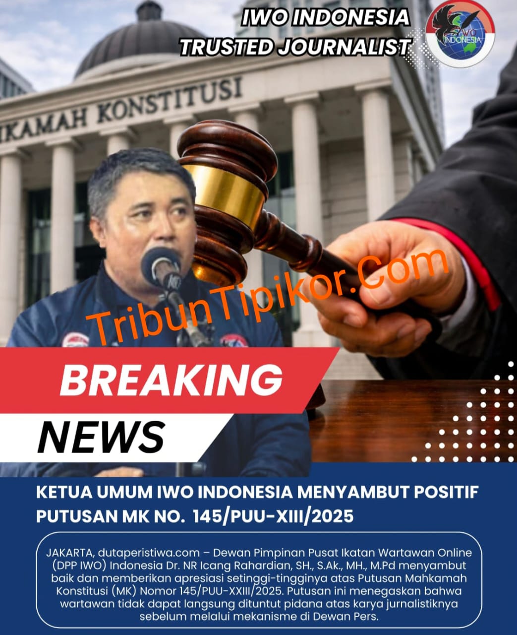 JAKARTA, tribuntipikor.com // Dewan Pimpinan Pusat Ikatan Wartawan Online (DPP IWO) Indonesia Dr. NR Icang Rahardian, SH., S.Ak., MH., M.Pd menyambut baik dan memberikan apresiasi setinggi-tingginya atas Putusan Mahkamah Konstitusi (MK) Nomor 145/PUU-XXIII/2025.