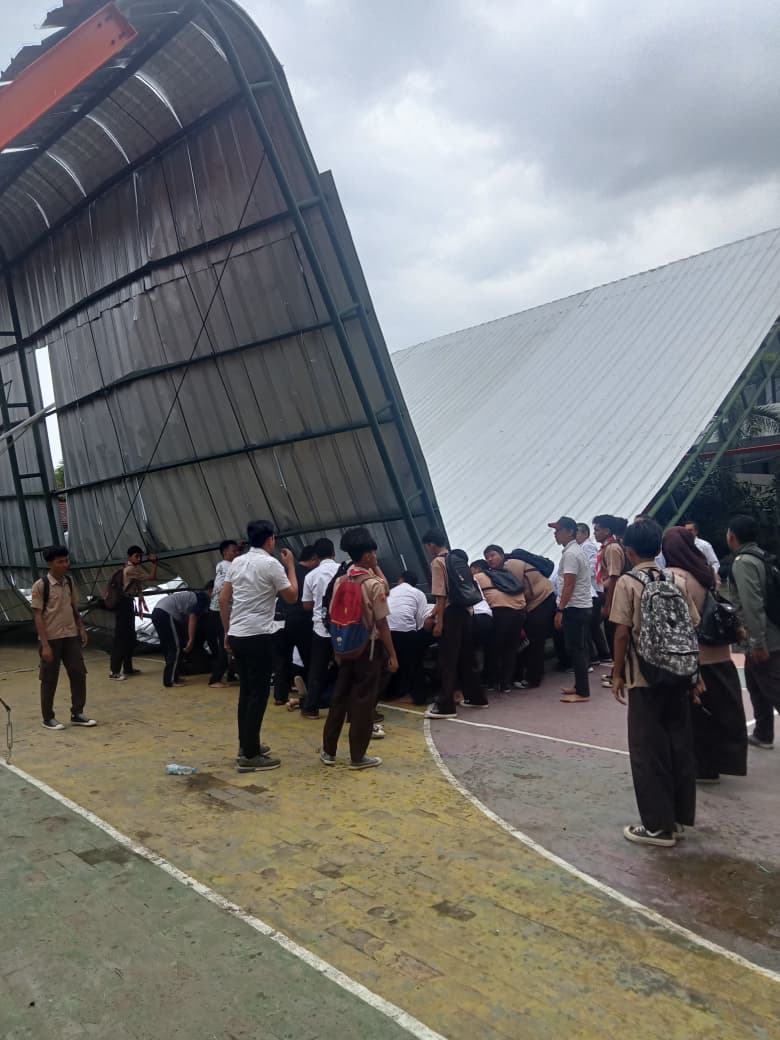 Insiden terjadi pada Rabu 21 Januari 2026 sekitar pukul 14.45 WIB saat angin kencang disertai hujan gerimis menerjang lingkungan sekolah. Dalam hitungan singkat, atap bangunan outdoor roboh dan menimpa area lapangan yang sedang digunakan untuk aktivitas siswa.