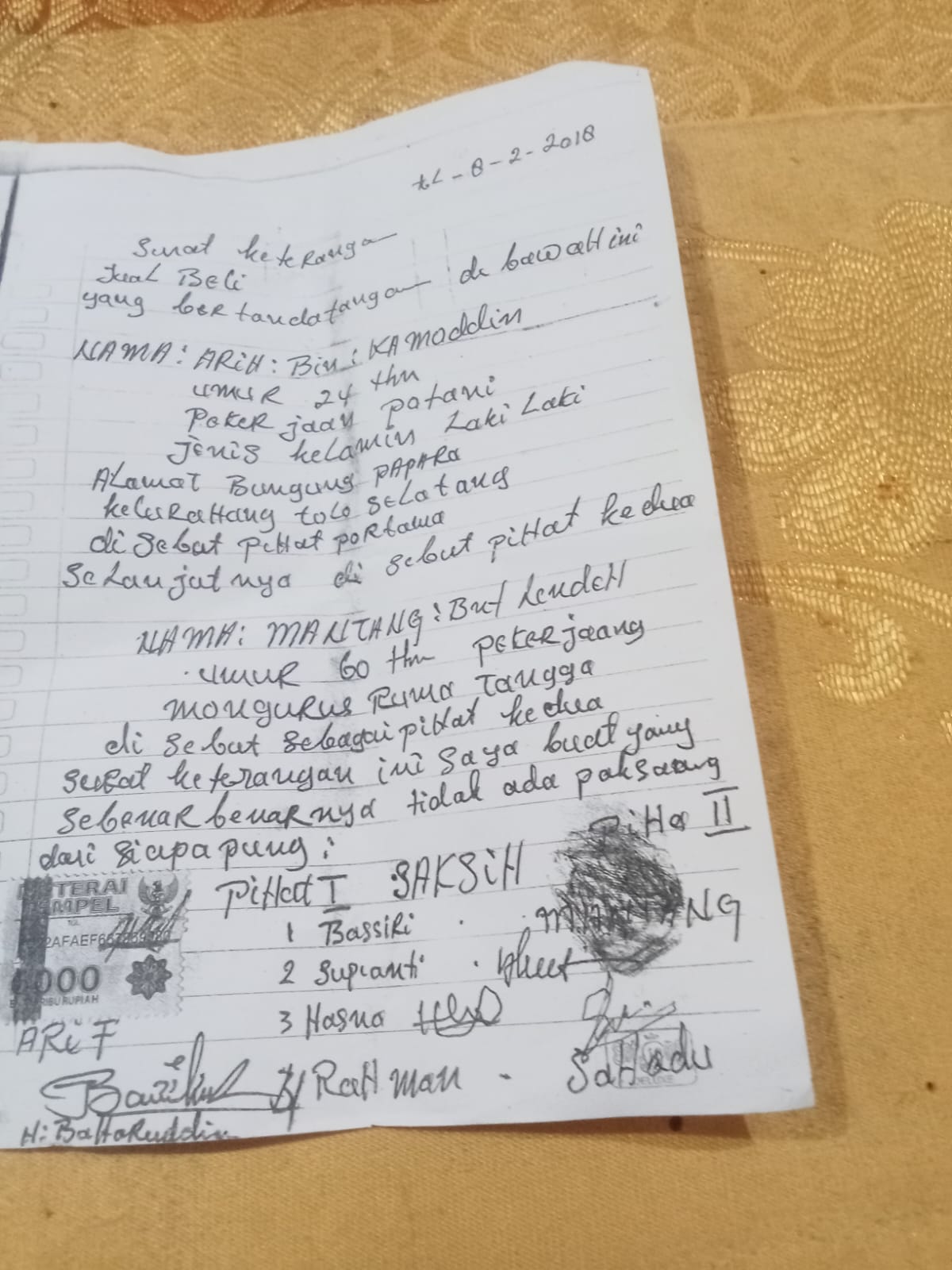 Adapun Kronologis tanah tersebut saya beli pada tahun 2018 sesuai surat Keterangan Jual – beli diatas,setelah meninggal suami saya CADU saya bersuami lagi ke Paitana akhirnya rumah saya yang ada di Tolo selatan saya kunci dan ikut sama suami ke Desa Paitana