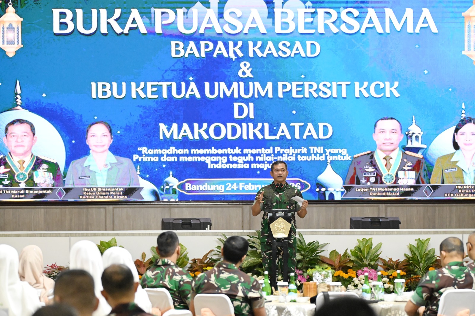 Bandung. Dalam suasana penuh kehangatan dan kebersamaan, Kepala Staf Angkatan Darat (Kasad) Jenderal TNI Maruli Simanjuntak, M.Sc., didampingi Komandan Kodiklatad Letjen TNI Mohamad Hasan melaksanakan kegiatan Buka Puasa Bersama dengan Keluarga Besar Kodiklatad bertempat di Aula M. Toha Kodiklatad, Selasa (24/2/2026).