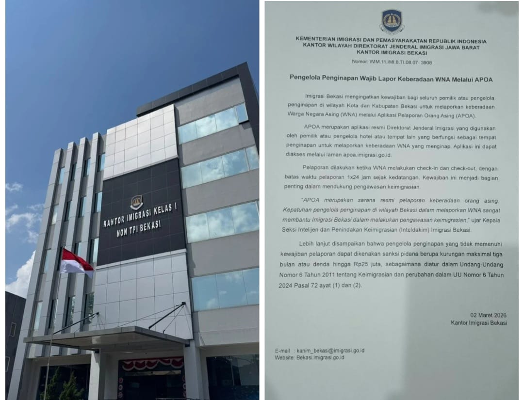 Kantor Imigrasi Bekasi mengingatkan seluruh pemilik atau pengelola penginapan di wilayah Kota dan Kabupaten Bekasi untuk mematuhi kewajiban melaporkan keberadaan Warga Negara Asing (WNA) yang menginap melalui Aplikasi Pelaporan Orang Asing (APOA).