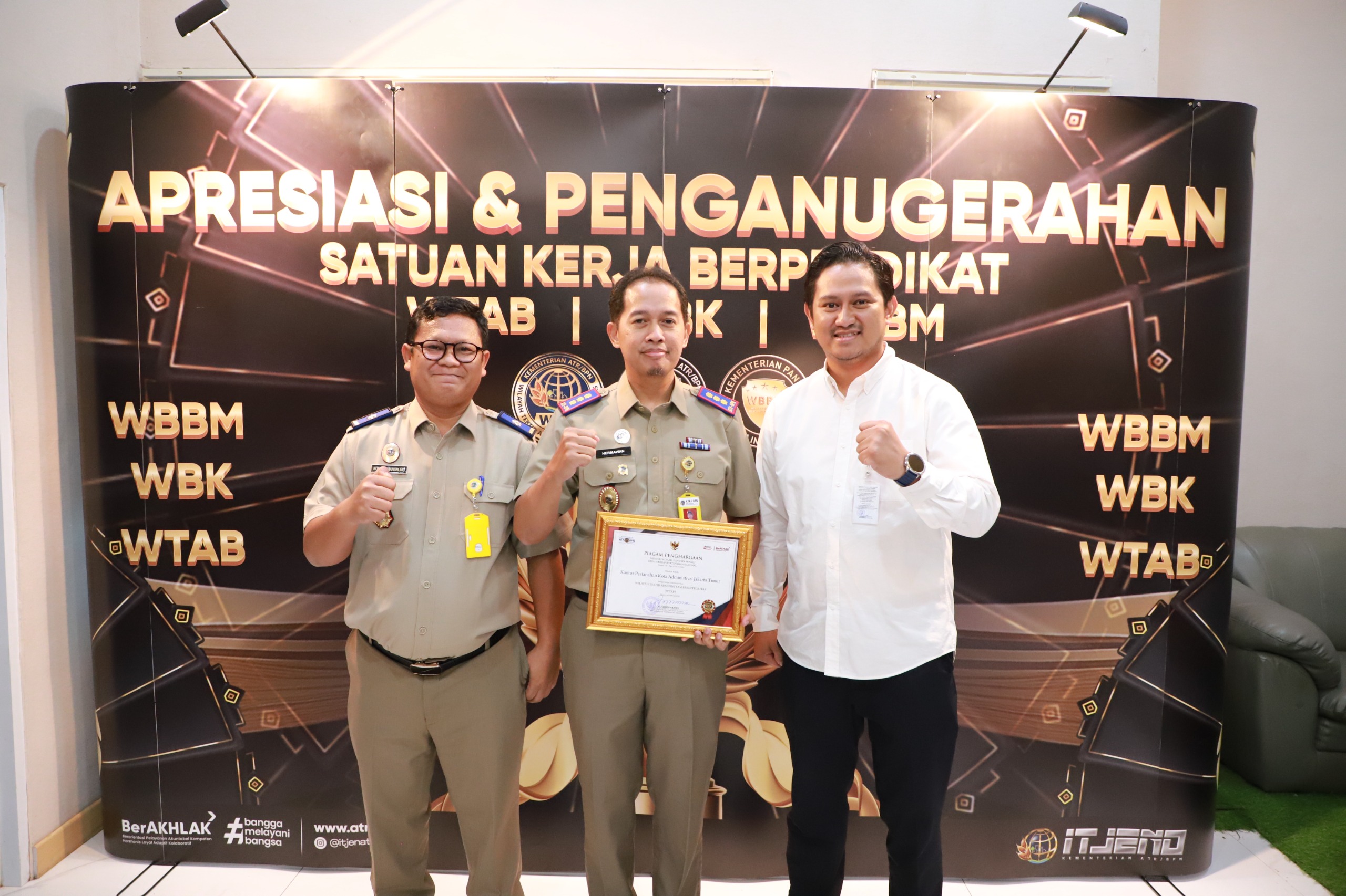 Dalam acara Apresiasi dan Penganugerahan Satuan Kerja Berpredikat Wilayah Birokrasi Bersih dan Melayani (WBBM) Wilayah Tertib Administrasi Berintegritas (WTAB) yang dilaksanakan pada Kamis (05/03/2026) di Aula Prona Kementerian Agraria dan Tata Ruang/Badan Pertanahan Nasional (ATR/BPN), Jakarta Selatan, Kantor Pertanahan (Kantah) Jakarta Timur berhasil meraih Predikat WTAB.