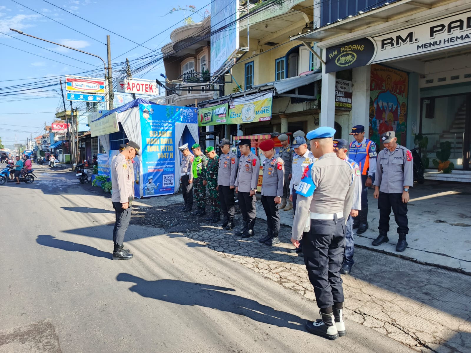 Kapospam Simpang Tiga Cikijing AKP Asep Rusmawan, S.H memimpin apel pengecekan Anggota Pos Pengamanan (Pospam) Simpang Tiga Cikijing, Minggu (15/03/2026). Apel ini dilakukan sebagai bentuk kesiapsiagaan Personil Pospam dalam menjaga keamanan dan ketertiban masyarakat, terutama dalam menghadapi peningkatan aktivitas masyarakat saat puncak arus mudik dan arus balik mudik pada libur idul fitri tahun 2026.