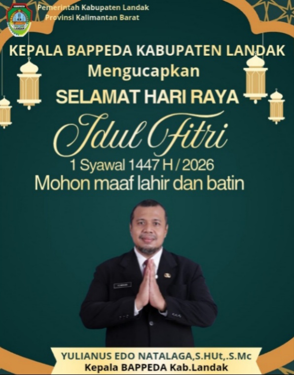 Kepala Dinas Bappeda Kabupaten Landak, Yulianus Edo Natalaga, S.Hut., S.Mc., menyampaikan ucapan Selamat Hari Raya Idul Fitri 1 Syawal 1447 Hijriah / 2026 Masehi kepada seluruh masyarakat kabupaten landak yang merayakan.
