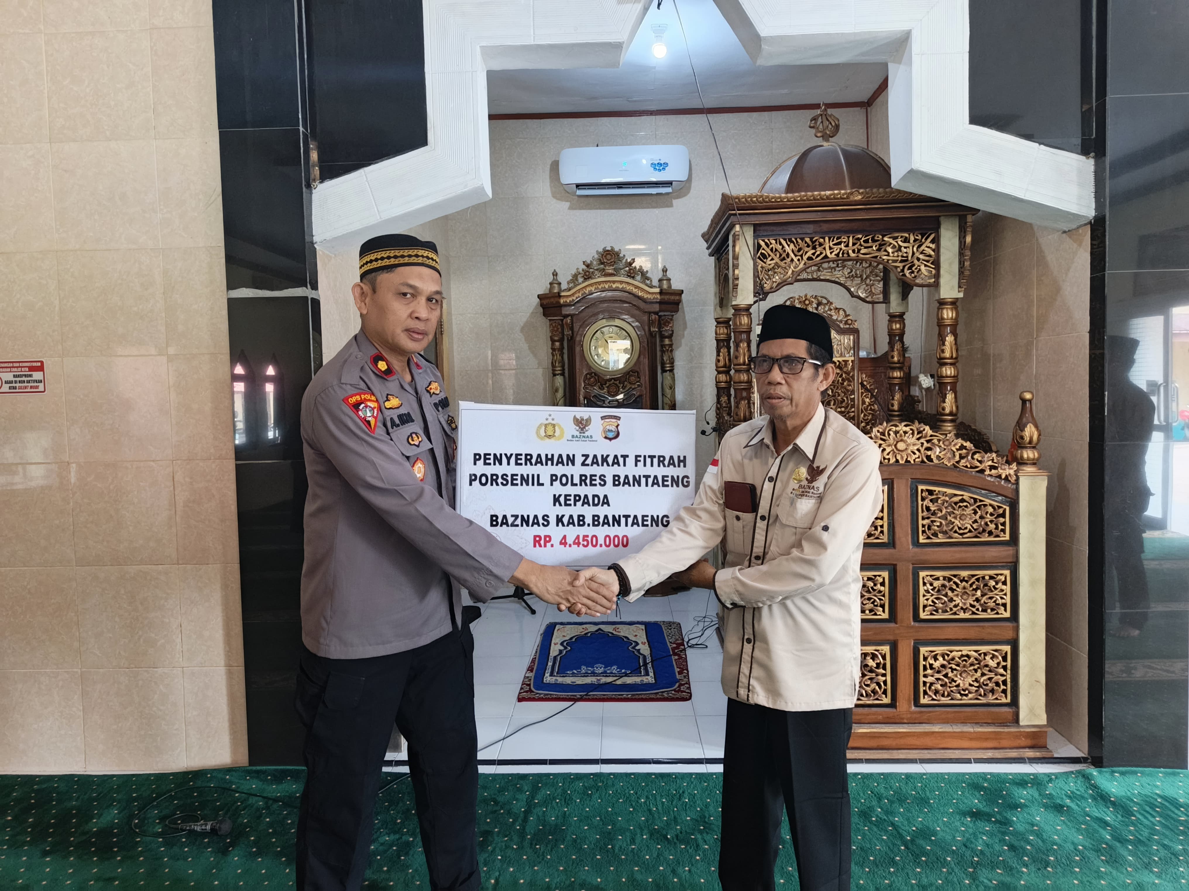 Suasana di Masjid Kurnia Ilahi Mapolres Bantaeng tampak khidmat saat simbolis penyerahan zakat berlangsung. Kegiatan ini diharapkan dapat mempererat silaturahmi antara kepolisian dan masyarakat.( Syamsiah/UH )