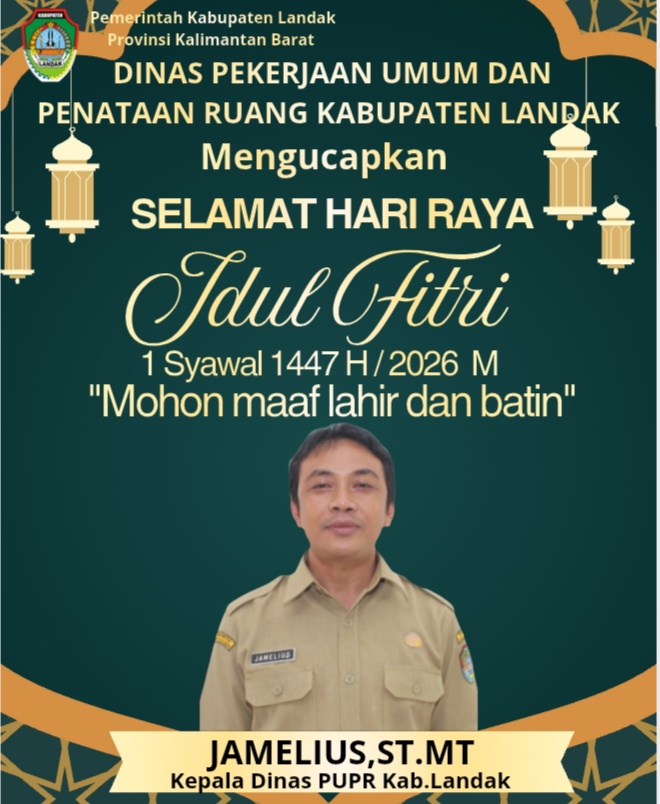 Dalam suasana penuh kebahagiaan dan kemenangan setelah menjalankan ibadah puasa Ramadan, Kepala Dinas Pekerjaan Umum dan Penataan Ruang (PUPR) Kabupaten Landak, Jamelius, S.T., M.T., menyampaikan ucapan selamat Hari Raya Idul Fitri 1 Syawal 1447 Hijriah/2026 Masehi.