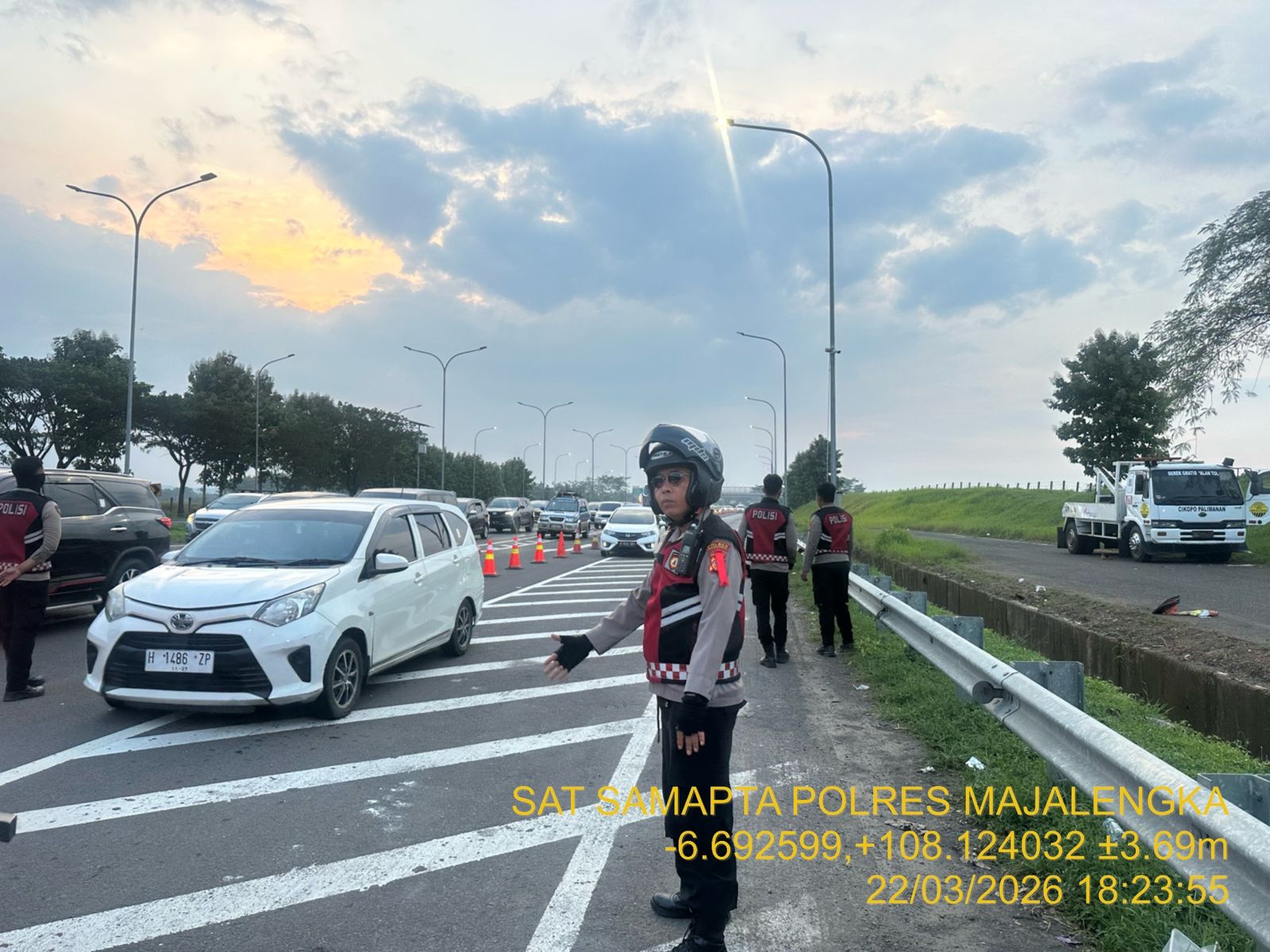 Menjamin kelancaran arus balik dan mobilitas masyarakat pada H+1 Hari Raya Idulfitri 1447 H, jajaran Polres Majalengka melalui Operasi Ketupat Lodaya 2026 memperketat pengamanan di jalur bebas hambatan. Pada Minggu sore (22/3/2026), personel Sat Samapta Polres Majalengka melaksanakan pengaturan lalu lintas intensif di KM 152 Tol Cipali, yang merupakan titik krusial pertemuan arus kendaraan.