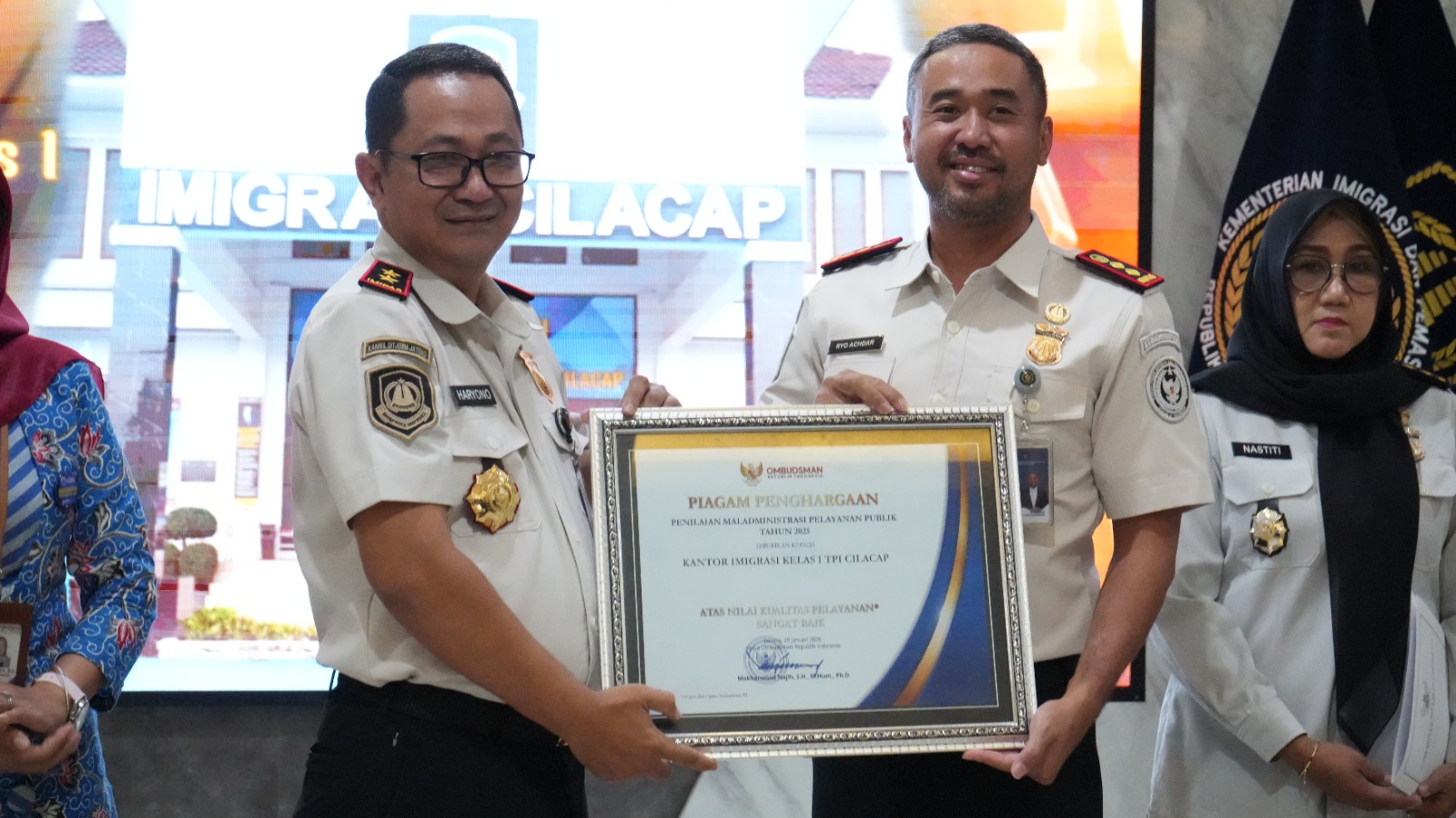 Dalam acara Penyampaian Hasil Kualitas Pelayanan Kantor Imigrasi pada Opini Tahun 2025 yang di selenggarakan oleh, Ombudsman Republik Indonesia Jawa Tengah pada hari Selasa (07/04/26), Kantor Imigrasi Kelas I TPI Cilacap berhasil meraih nilai akhir 88,12 dengan predikat “Sangat Baik”.