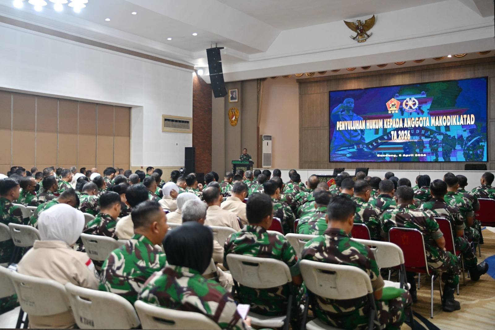 Bandung. Direktur Umum (Dirum) Kodiklatad Brigjen TNI Saiful Rizal, S.Sos., yang diwakili Pabanpers Sdirum Kodiklatad Kolonel Inf Hendi Ahmad Pribadi, S.I.P., M.I.P., M.Han., memimpin kegiatan penyuluhan hukum TA 2026 yang dilaksanakan di Aula M. Toha Kodiklatad, Selasa (8/4/2026).