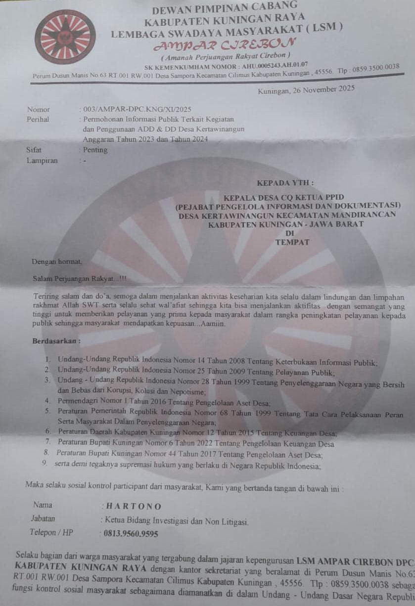Transparansi Anggaran Desa Kertawinangun Jadi Sorotan, LSM AMPAR Layangkan Surat Permohonan Informasi Publik.